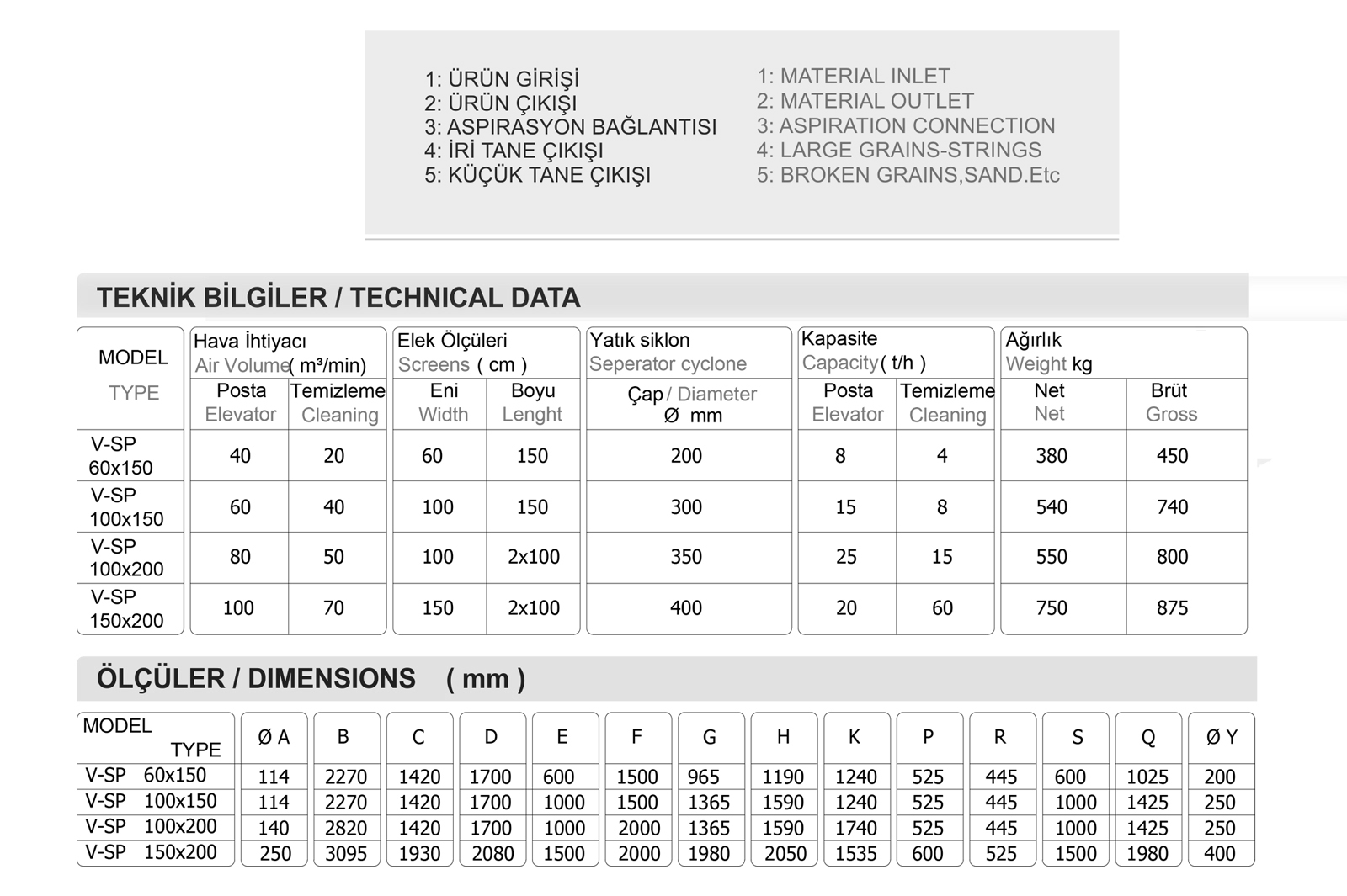 Özellikler Un fabrikalarında kullanılan yeni model çöp sasörüdür. Vibro motorlar yardımıyla başarılı bir eleme sağlanmıştır. Bu modelde kayış, kasnak, rulman ve askı çubuğu gibi problemli malzemeler kullanılmamıştır. Elek kasaları çok kolay sökülebilme özelliğine sahiptir. Un fabrikalarının yanında, her türlü bakliyat tesislerinde sınıflandırıcı olarak kullanılmaktadır. Posta temizleme ünitelerinde Ø (10~12) mm yuvarlak delikli elek, hassas temizleme ünitelerinde ise Ø (7~8) mm yuvarlak delikli elek kullanılmaktadır. Alt elekler de ise üçgen delikli veya Ø 2 mm delikli eleklerin her ikiside kullanılmaktadır.